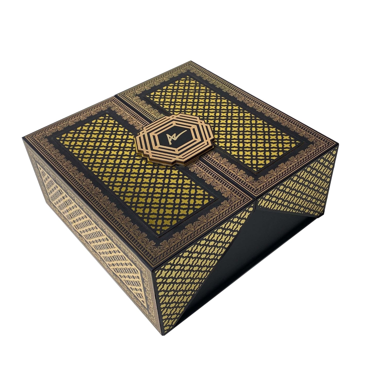 A sophisticated black and gold wedding invitation book with geometric art deco patterns. The luxurious design is complemented by gold foiling that exudes elegance and a classic aesthetic, perfect for a glamorous wedding.