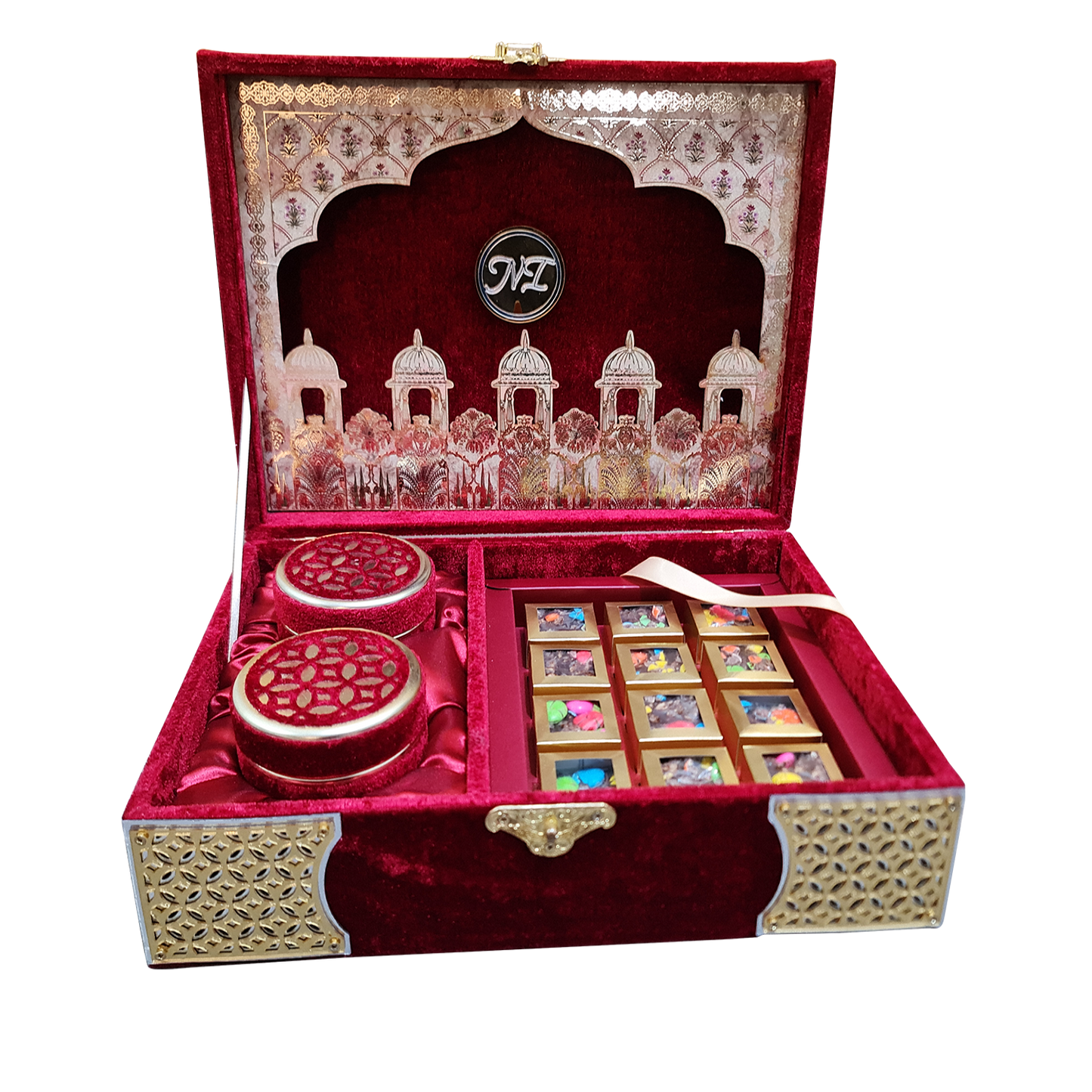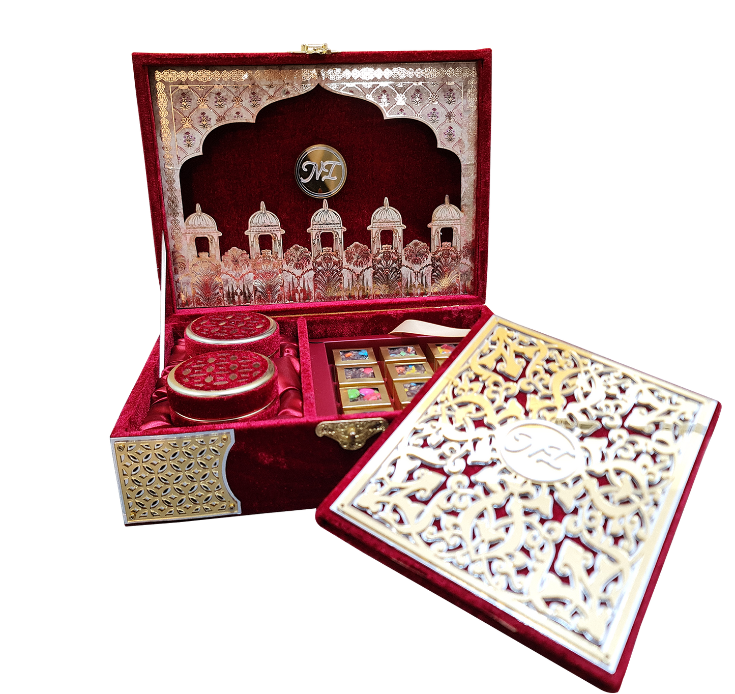 Step into a royal affair with our Luxurious Mughal Garden Wedding Invitation Box. This exquisite set is inspired by the opulent Mughal architecture, featuring intricate filigree work and a plush velvet interior. The rich red and gold color palette evokes the splendor of a bygone era, with detailed artwork depicting traditional Mughal gardens under arches. Each box contains a beautifully crafted invitation card, RSVP cards, and a compartment holding sweets or gifts, making it a true collector's item. Perfect for grand weddings, this invitation box promises a memorable introduction to your special day with its unmatched elegance and cultural richness.
