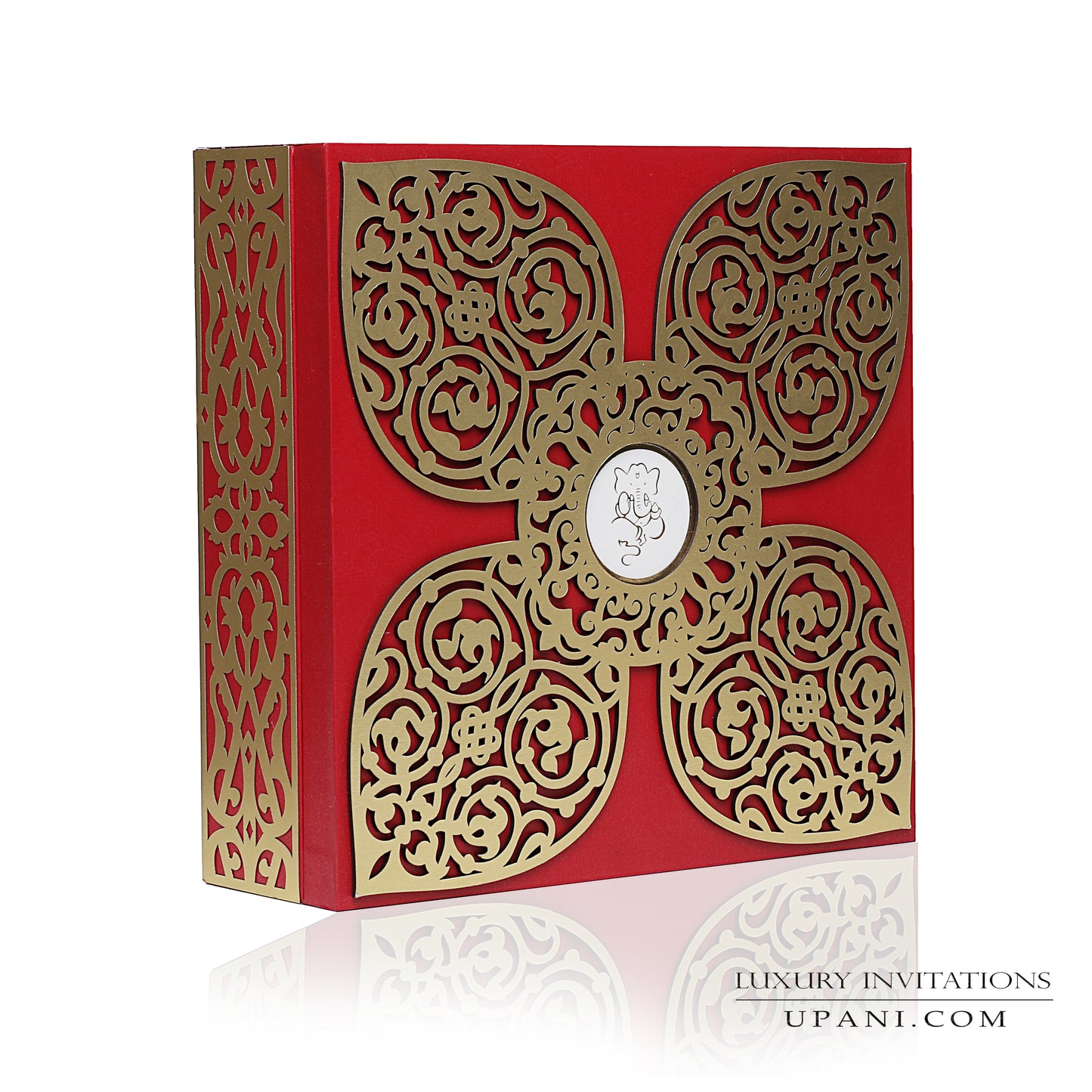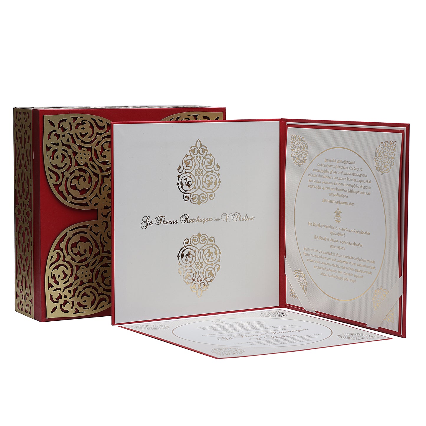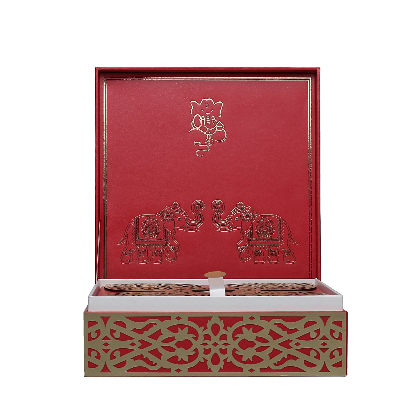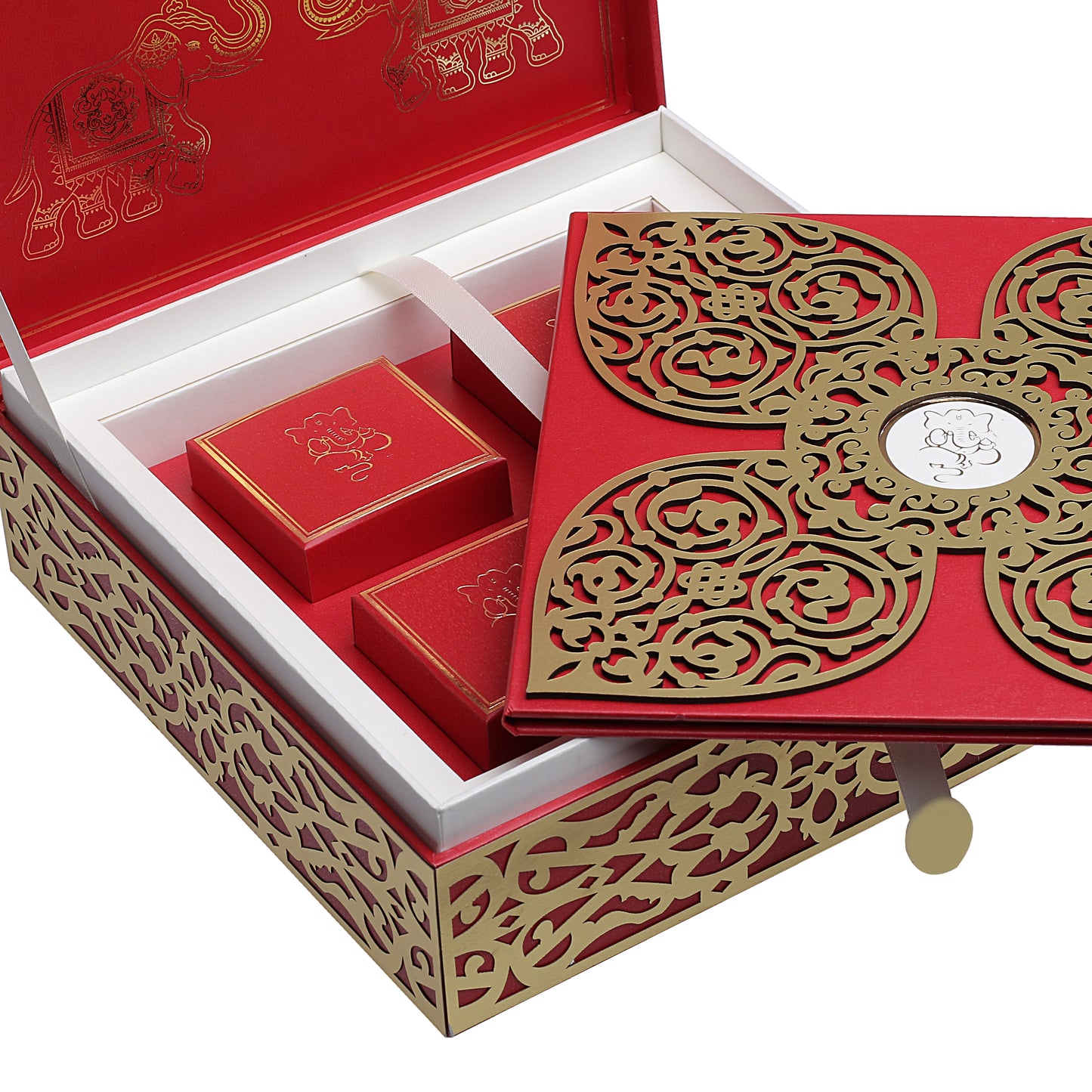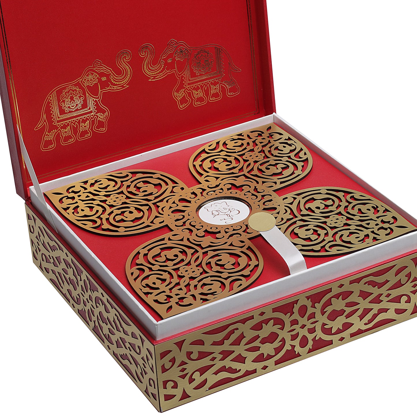This exquisite red and gold wedding invitation box features intricate laser-cut designs, multiple compartments, and elegant presentation, perfect for making a grand impression on your special day.