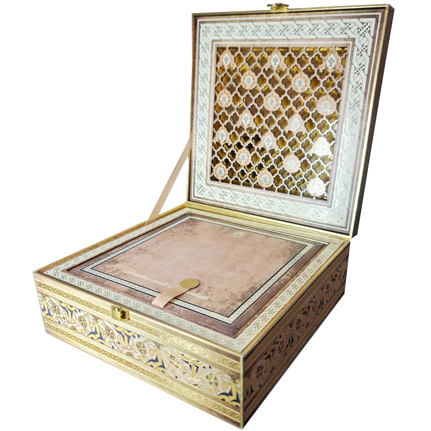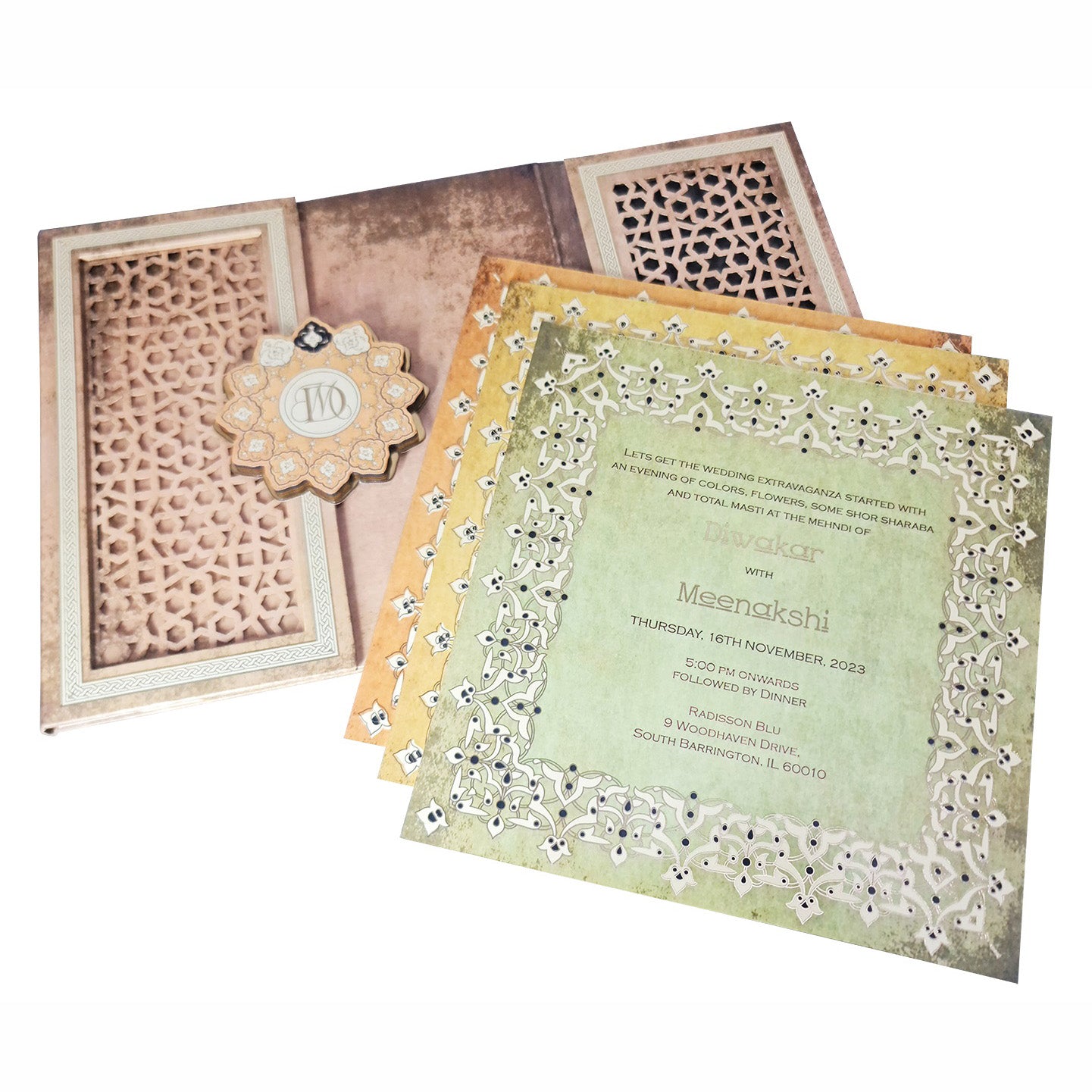 Introducing our Exquisite Traditional Wedding Invitation Box, perfect for adding a touch of elegance and grandeur to your special day. This beautifully crafted box features intricate patterns and a regal design, reminiscent of traditional Indian artistry.